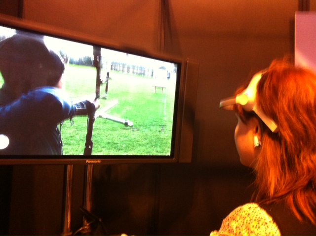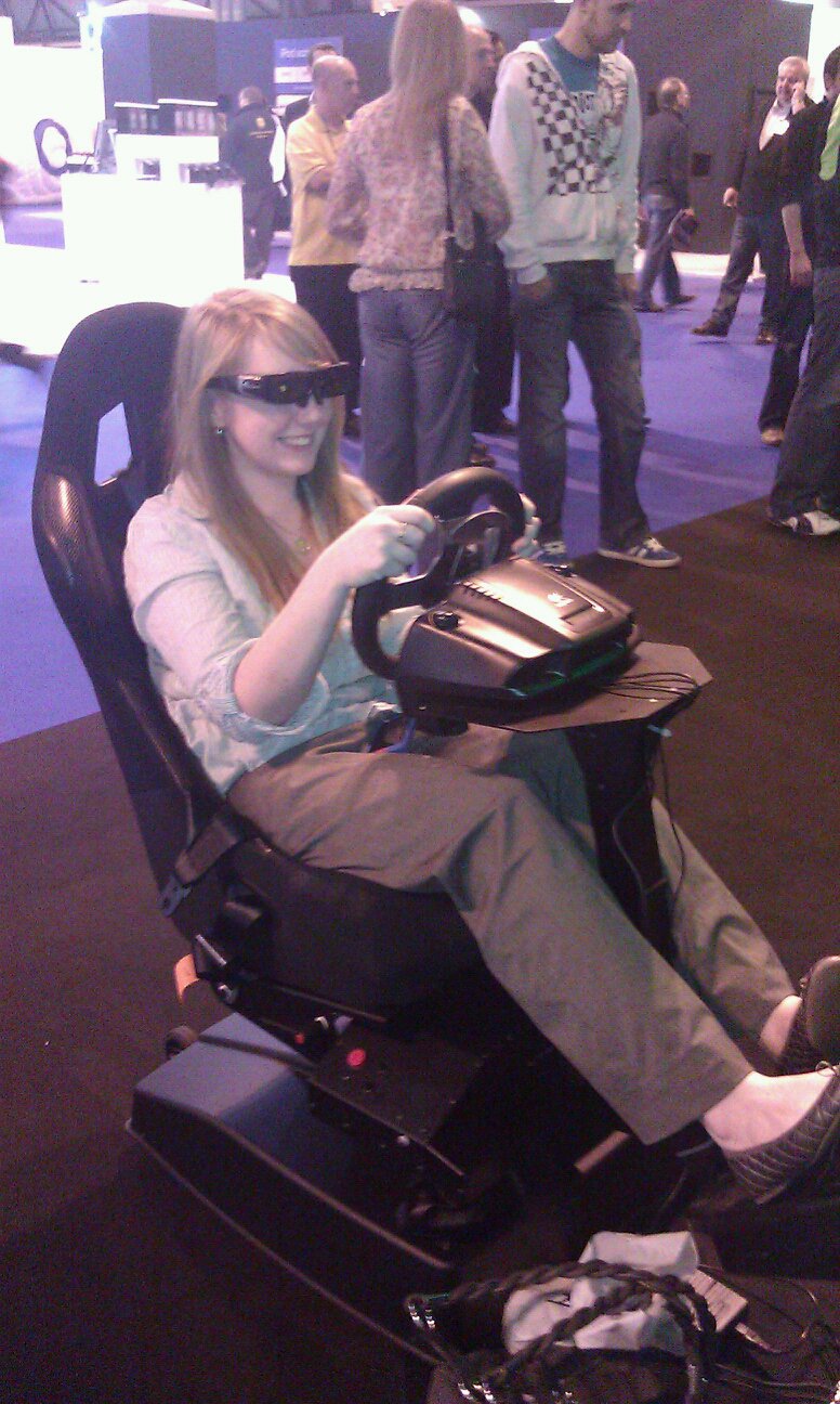Laura, our Online Blogger Liaison, tried her hand at a spot of 3D gaming with NVIDIA 3D vision, which gives you the ultimate 3D experience right at your fingertips on your desktop or notepad. As they had specially-designed moving seats at the show it was a bit of a bumpy ride on the racing game she tried! Here she is enjoying herself – or more accurately, crashing the car every two minutes and screaming quite a lot.