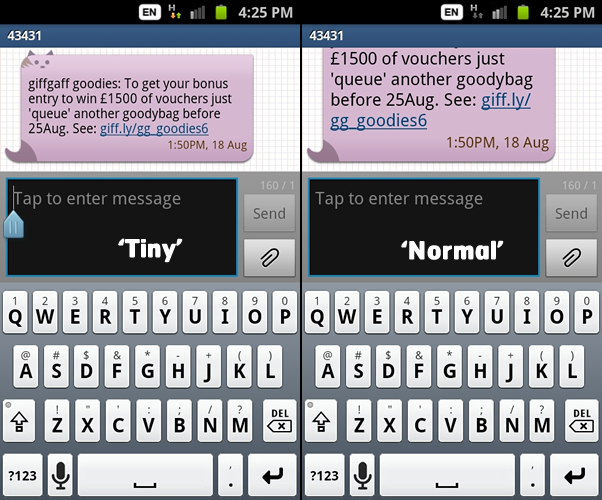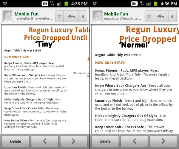 If you’ve got good eyesight or corrected-to-good eyesight, then you’ll be able to easily read a much smaller font. In the Messaging, Gmail and Internet apps, just select the smallest font size available in the settings menu (which is accessed by pressing Menu -> – ‘Tiny’ in the Messaging and Gmail apps and Default Size as ‘Far’ in the Internet app.