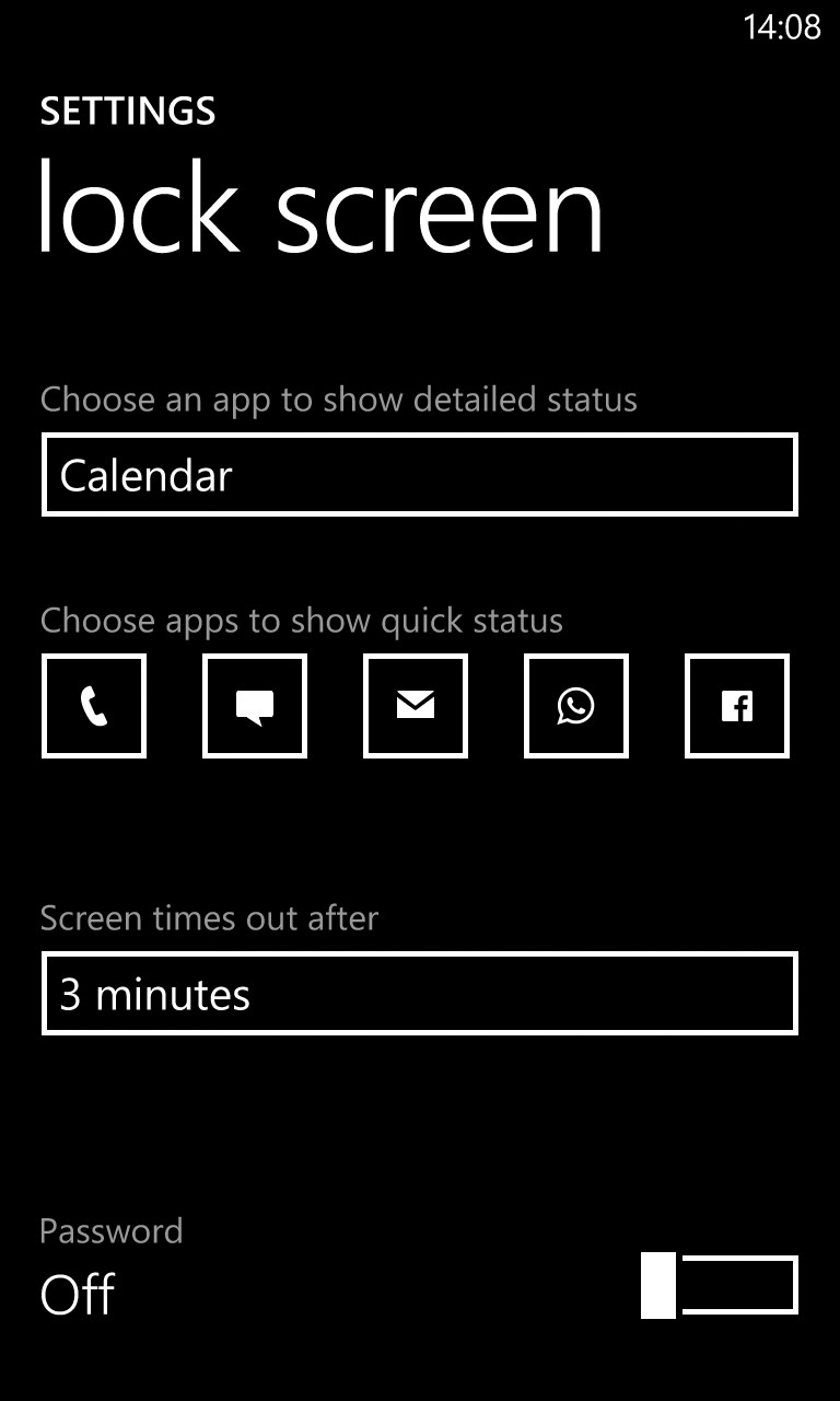 On this example I have 1 unread message (SMS or Facebook message) and 2 unread Whatsapp messages. You can choose up to 5 apps for which to see a ‘quick status’. I have selected the phone, messaging, email, whatsapp and Facebook apps. The relevant icons appear only when you have a notification such as a missed call or unread message.