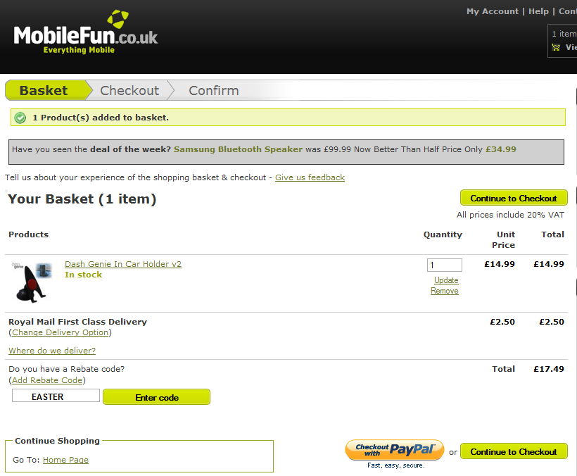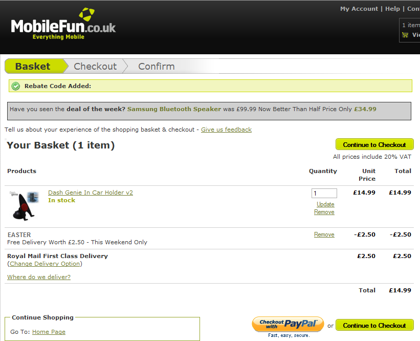 If you’ve finished shopping, click on “Place Your Order” to proceed to the checkout and make payment. If you want to carry on browsing the site, click on “Continue Shopping” & the delivery discount will remain in your basket.